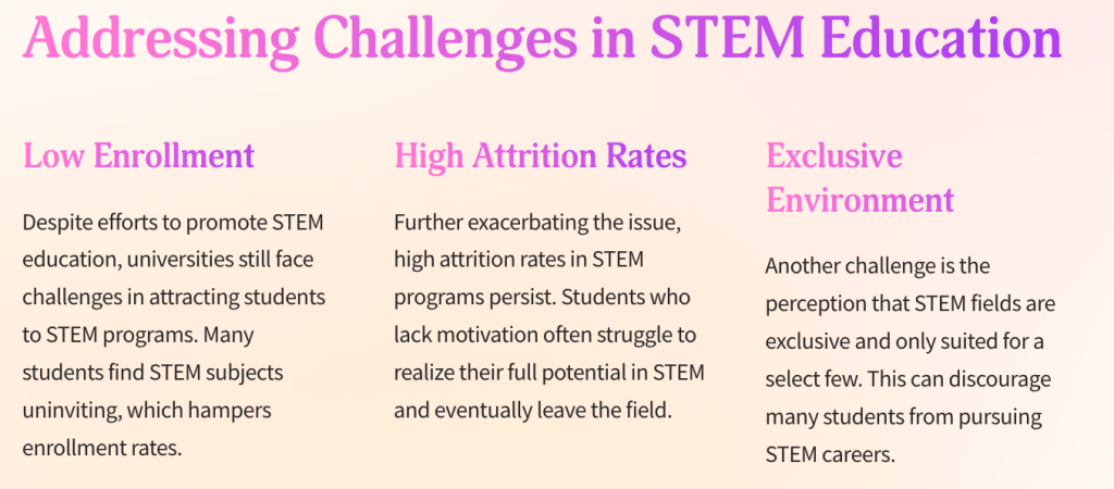 Yet, despite these efforts, universities continue to face challenges like low enrollment and high attrition rates in STEM programs7.