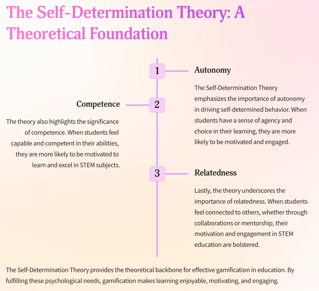 While the potential of gamification in STEM education is evident, it’s essential to explore its effects more deeply. How does it influence student motivation, as measured by the Self-Determination Theory? This question is at the heart of the work I’m engaged in.