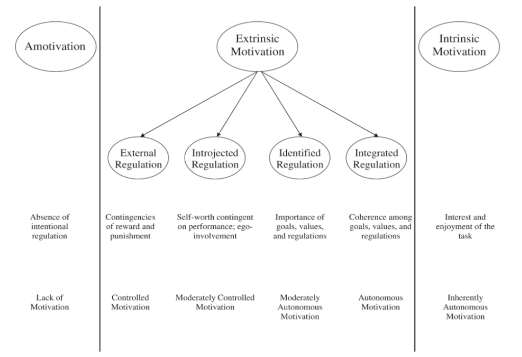 The three psychological needs of autonomy, competence, and relatedness were not randomly chosen. These needs emerged from multiple empirical processes and were the only way to psychologically justify the interpretation and integration of research results in intrinsic motivation and internalization (more commonly identified as self-determined extrinsic motivation)2. The Self-Determination Theory introduces a continuum of motivation, shedding light on the interplay between intrinsic and extrinsic motivations3.