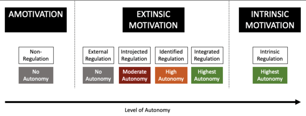 However, when external forces like rewards or punishment drive motivation, it becomes controlled motivation. Each person involved in a task or activity becomes controlled by the desire to receive a reward or avoid punishment, which ultametly diminishes motivation once it is removed2 . Thankfully, extrinsic motivation can be internalized to become varying levels of autonomous. The self-determination theory accounts for these varying changes in extrinsic motivation through the concept of internalization. Simply put, people are naturally inclined to take external regulators and change them into internal ones to feel more self-determined while enacting them.