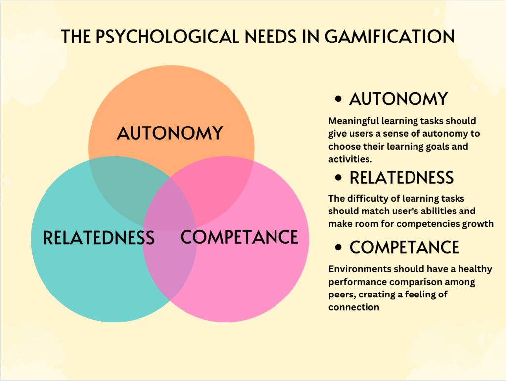 The incorporation of gamification strategies has garnered attention for its potential to enrich learning and increase engagement. In a previous blog post, we discussed a Framework for Success that gives seven steps to designing a successful gamfied model from the lens of the Self-Determination Theory. While this framework gave us a high-level overview of how we can design for successful gamification, it did not go in-depth into each of the three psychological needs and how they support gamification on a individual basis.