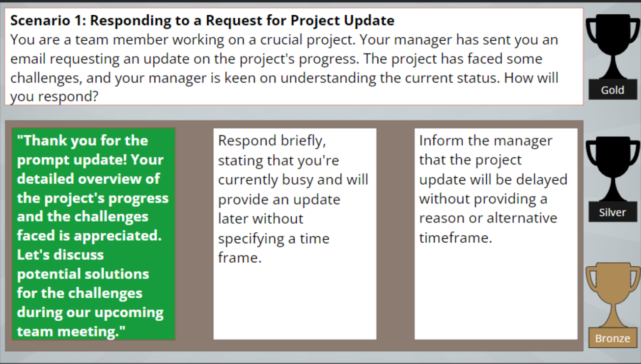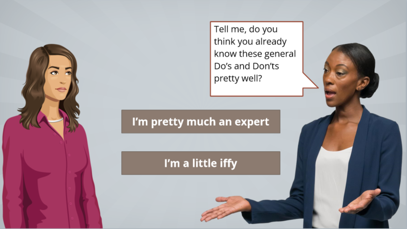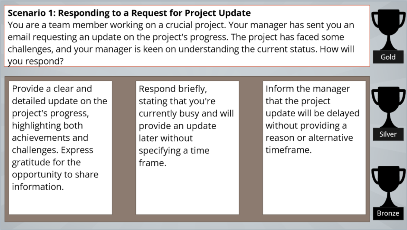 At the end of this gamified training, learners/players are given three real-world scenarios to navigate. Three choices accompany these scenarios. One choice will have a positive outcome, while the others will garner a negative outcome. Learners/players are given this feedback in two manners.
