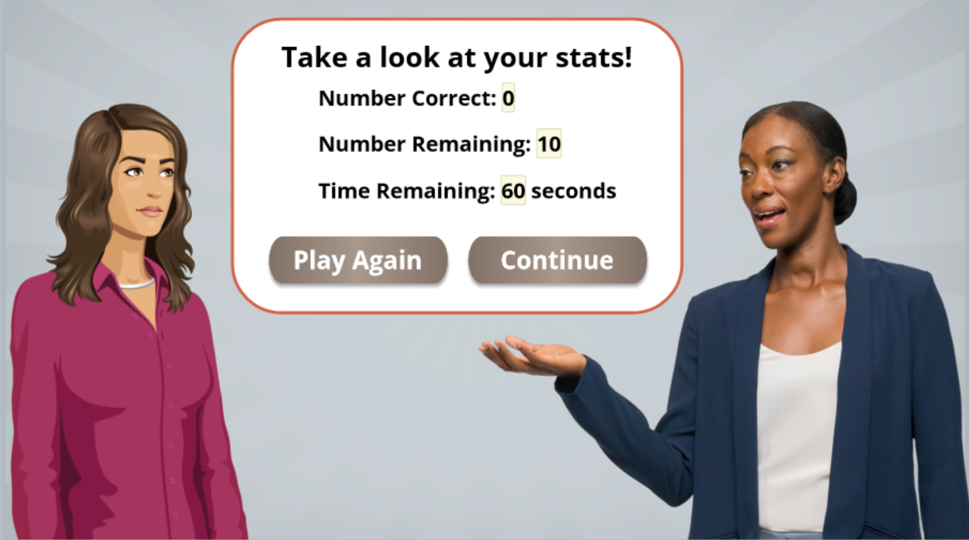 So what exactly made this same activity a challenge vs a knowledge check? Loss aversion! During the challenge version of this drag and drop, learners/players were penalized by 5 seconds for every incorrect answer they submitted. Instead of having the full 60 seconds that are originally allotted, learners/players can reduce their time allotment, endangering their chances of finishing! This loss aversion is not applied to the knowledge check version, as the user indicated they are not as knowledgeable in this content, and it would be detrimental to their need for competence. I truly hope you enjoy this feature as much as I did while building it!