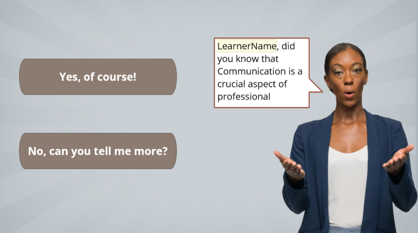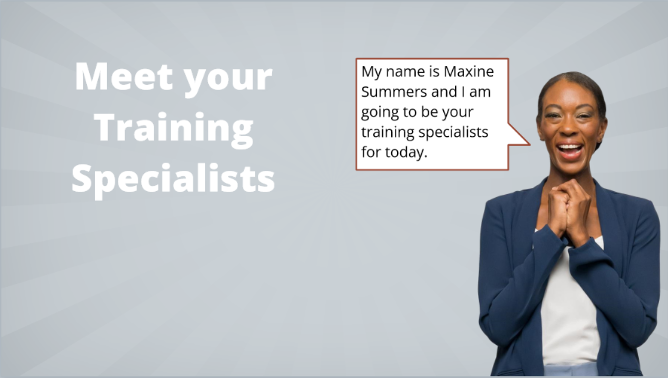 Next, let’s add a training specialist named Maxine Summers. Maxine is the main character in the storyline, narrating this experience and helping the learners/players progress successfully through their gamified training experience.
