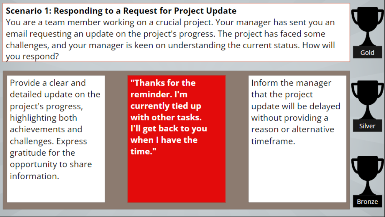 First, when they click on their desired response, they are immediately given a response email highlighted as green or red. The green indicates a positive outcome, and the red indicates a negative outcome. Learners/players are also awarded a trophy for each correct response. These trophies are only rewarded for correct answers and will change to their appropriate color when the learners/players click the correct response. This gives the learner not only an auditory form of feedback but a visual cue as well.