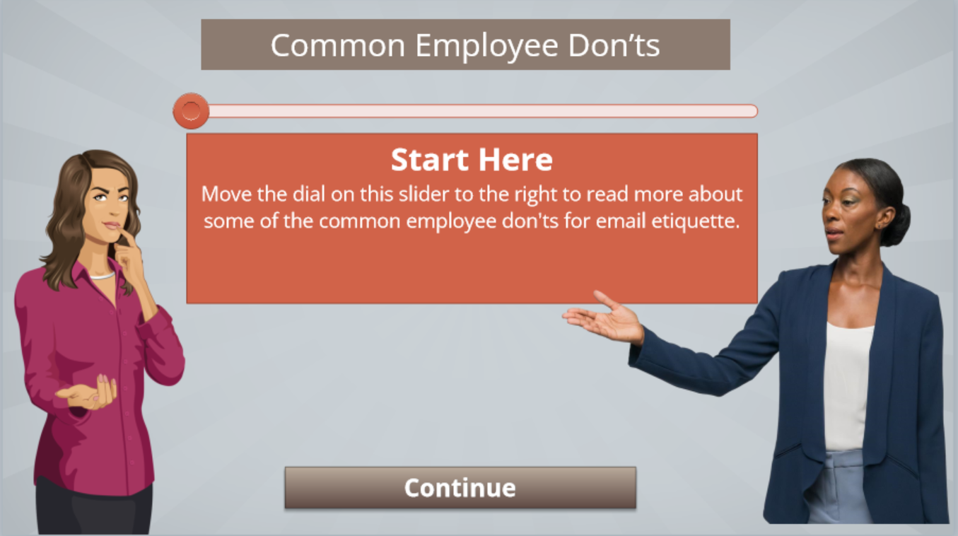 The topic of this training is mastering email etiquette. Now, since that topic is so broad, let’s add some substance to it and create this interactive training from the perspective of enhancing communication skills via email from the perspective of a manager or employee.