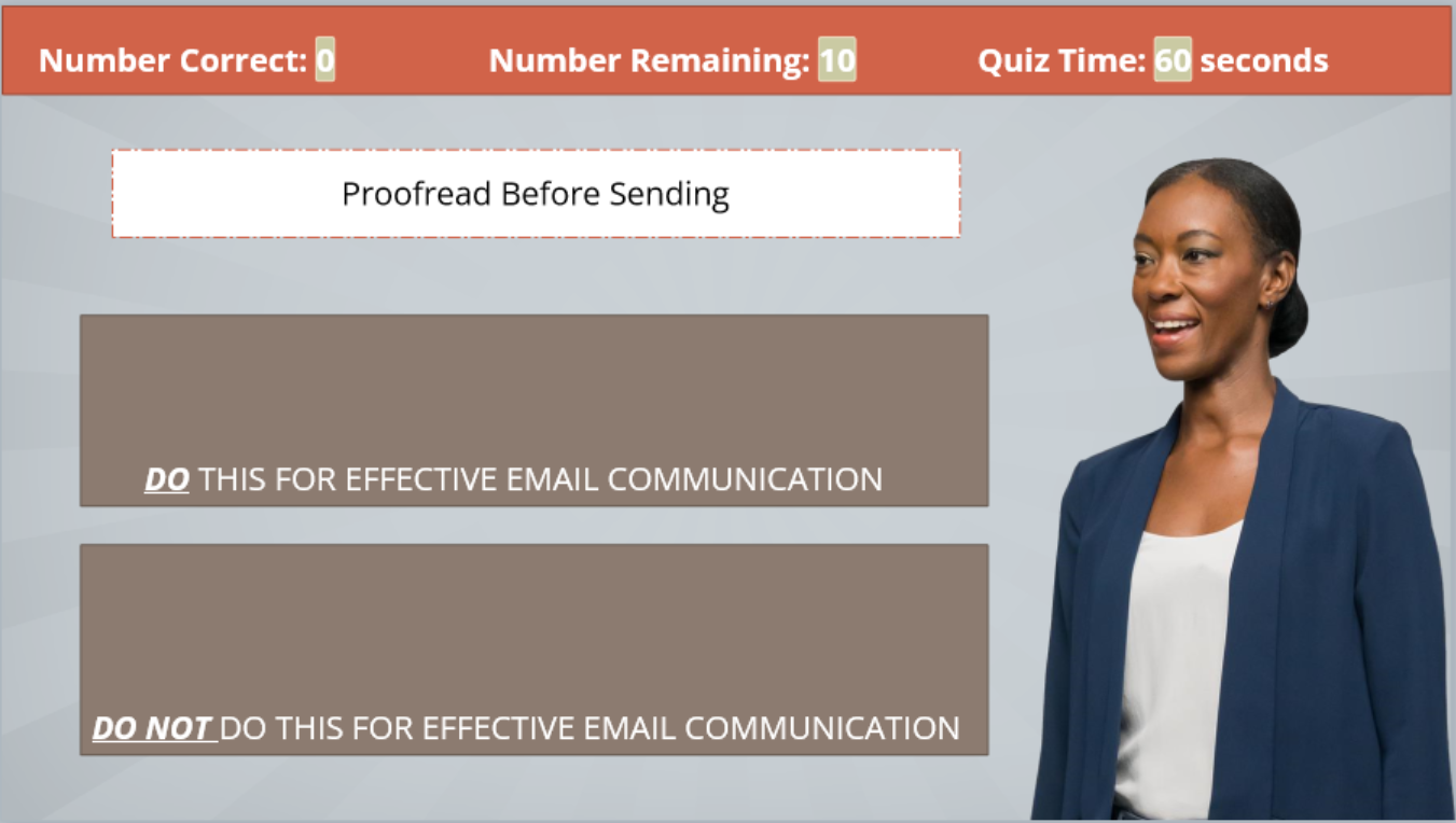 Learners/players experienced this drag-and-drop based on the skill level they disclosed in the path discussed earlier. If the learners/players expressed that they were a little iffy, they could learn the information first and then use this drag-and-drop as a timed knowledge check. If they said they were experts, they were immediately given this drag and drop as a timed challenge.