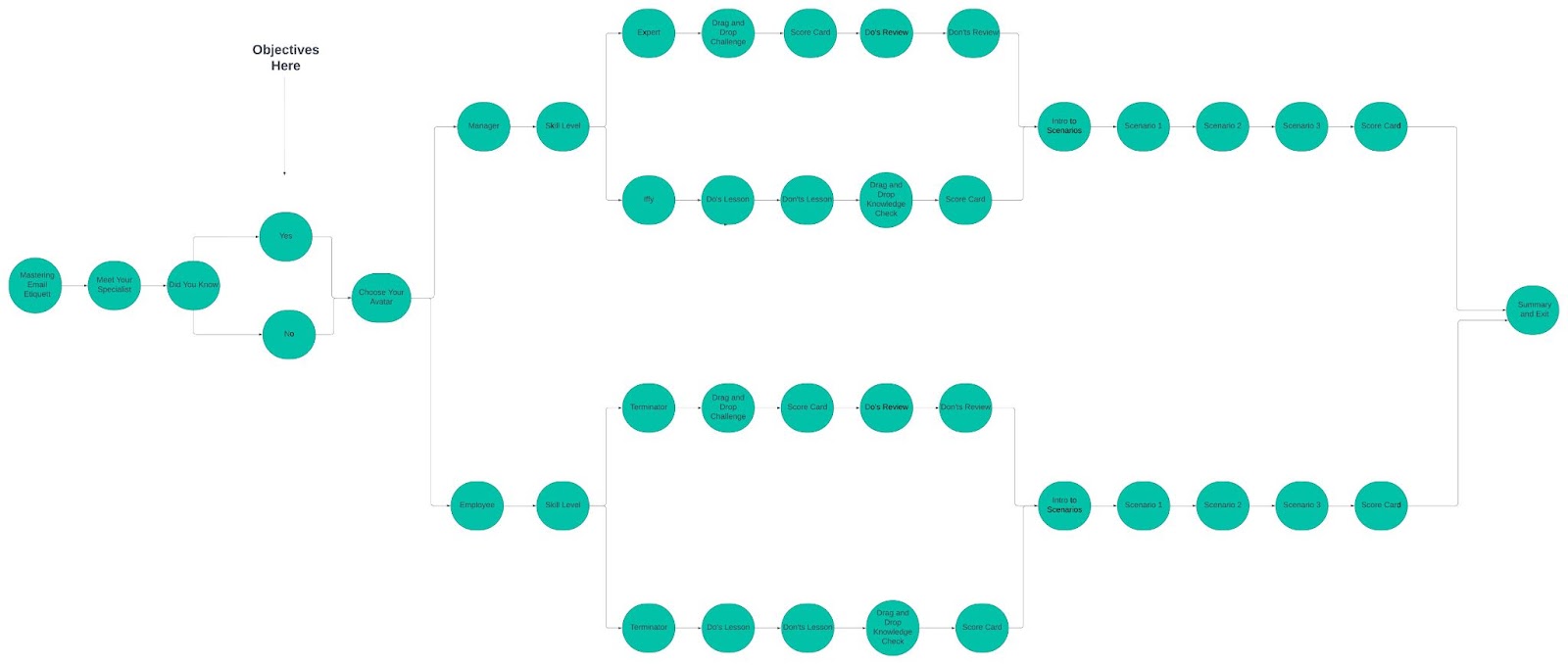 Before we conclude, remember that this gamified experience can be interacted with from two perspectives: the employee or the manager. Therefore, the drag-and-drop and the real-world questions have two different sets of information and scenarios. So, this gamified experience has two different built-in paths. Take a look at the flow chart below.