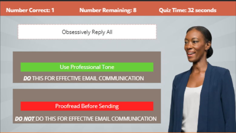 The storyline for this experience is simple: Maxine is here to walk the learners/players through a personal experience of effective communication while emailing, depending on whether you are a manager or an employee.