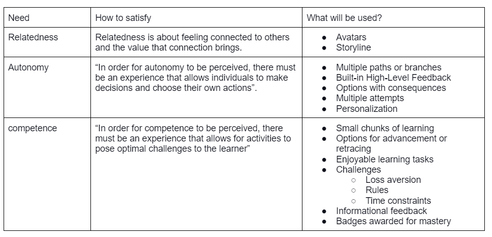 Therefore, let’s begin by determining what game dynamics and mechanics should be present to satisfy each of the three needs of the self-determination theory. In the post above, I break down each of the three needs and what dynamics and mechanics can help satisfy these needs. Let’s use some of those ideals and create a table of dynamics and mechanics that will be included in this email etiquette gamified experience.