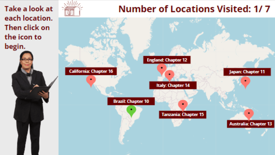 Another exciting part of this gamified adventure was mapping each chapter to a unique, real-world location. Each destination wasn’t just a backdrop; it ties in with the topic of the chapter, providing an additional layer of context and engagement. Students have the opportunity to click on a fun fact for each location, learning something extra special about how that location ties to the topic of the chapter.