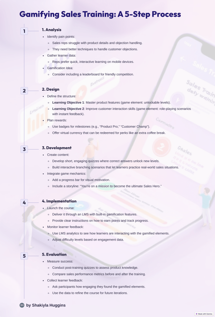To illustrate how to apply Urh et al.’s gamification framework, let’s explore an example. Imagine a company aiming to enhance its sales team’s product knowledge and improve their ability to handle customer interactions. Traditional e-learning modules might provide content through slides, videos, and quizzes, but adding gamification can significantly boost engagement and retention. Here’s how the ADDIE model and gamification framework can be applied to create a highly engaging and effective training program. Click on this document to view a more detailed process.