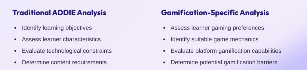 The analysis phase of the ADDIE model is crucial for laying the foundation of a successful gamified e-learning experience. In this stage, instructional designers gather essential data on pedagogical and technological requirements, while also assessing the specific needs of learners and the learning environment. When incorporating gamification, this phase expands to include an evaluation of which game mechanics might be most engaging and effective for the target audience.