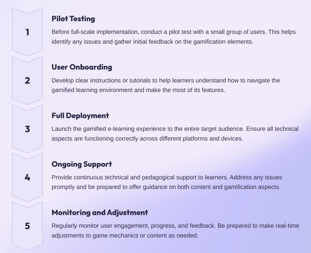 During implementation, it’s crucial to maintain open communication channels with learners. Encourage feedback and be responsive to user concerns or suggestions. This not only helps in improving the current learning experience but also provides valuable insights for future gamified e-learning projects.